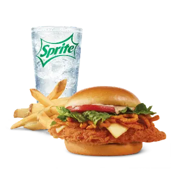 Ingredients: A crispy spicy chicken breast filet with ghost pepper ranch sauce, ghost pepper American cheese, ghost pepper‑seasoned crispy onions, fresh lettuce and tomato on a toasted premium bun, served with natural‑cut fries and your choice of drink.